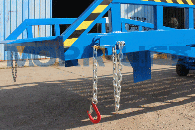 Deep overlap of ramp frame at the high end assures that the ramp rests firmly on the container body or dock floor. The safety chains and hooks provide added security and increase safety. When correctly rigged, chains join the yard ramps and vehicles into a single unit.