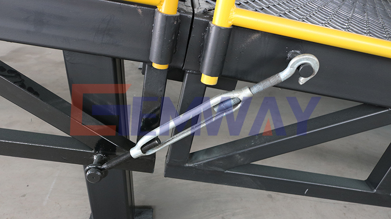 The three parts of the detachable yard ramp are strongly supported and connected by steel beams at the bottom of the ramp plate. When forklift is moving on the ramp, the weight can be dispersed on the whole ramp, prolonging the work life and guaranteeing safety. Plus, there are hooks used for reinforcing the connection of each two parts, making the detachable parts joint steadily and durably.