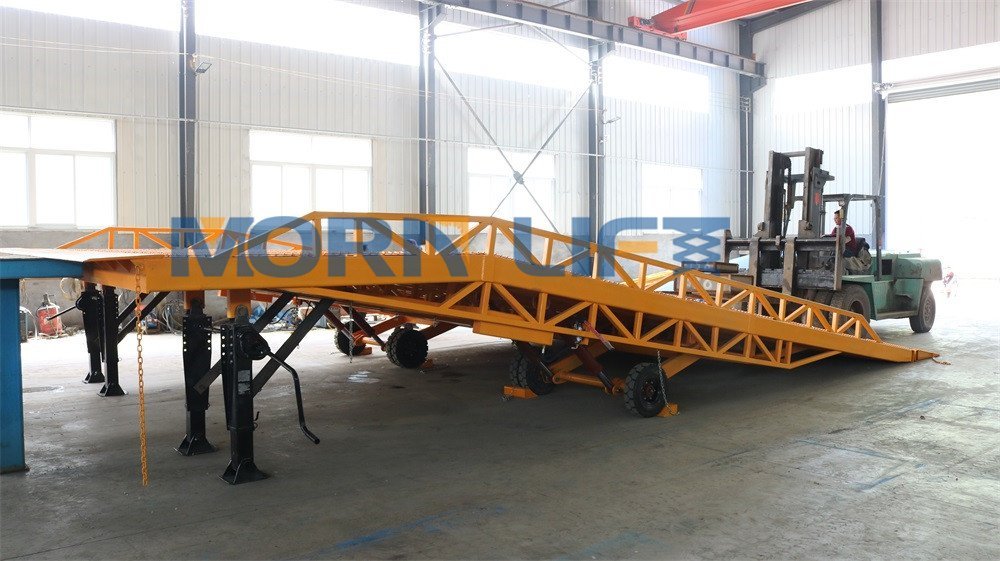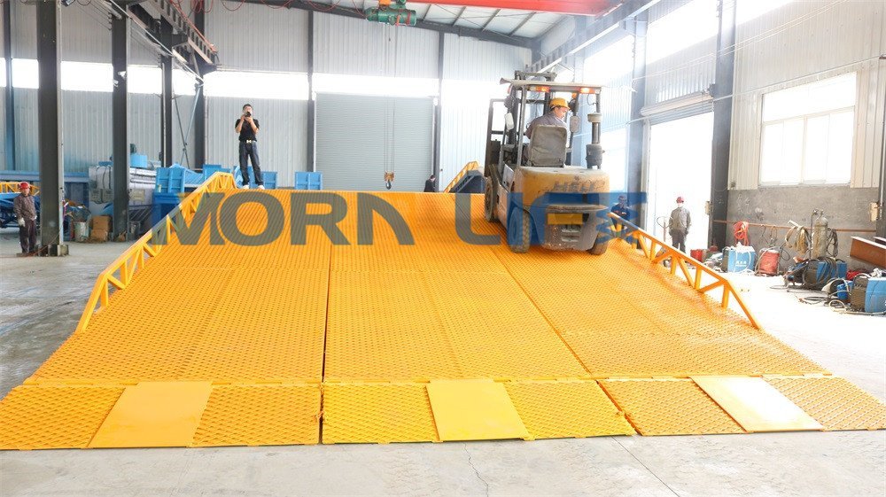 Double hydraulic systems were adopted to provide sufficient lifting power; 4 parallel solid tires were installed to help the ramp move flexibly; 4 strong supporting legs to offer stable support for the ramp during loading and offloading work; the grid anti-skid platform was welded with three parts of reinforced hard steel plates. Its great load capacity and wide ramp platform can allow 3 forklifts to work simultaneously, highly efficient and fast.